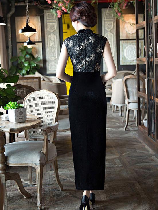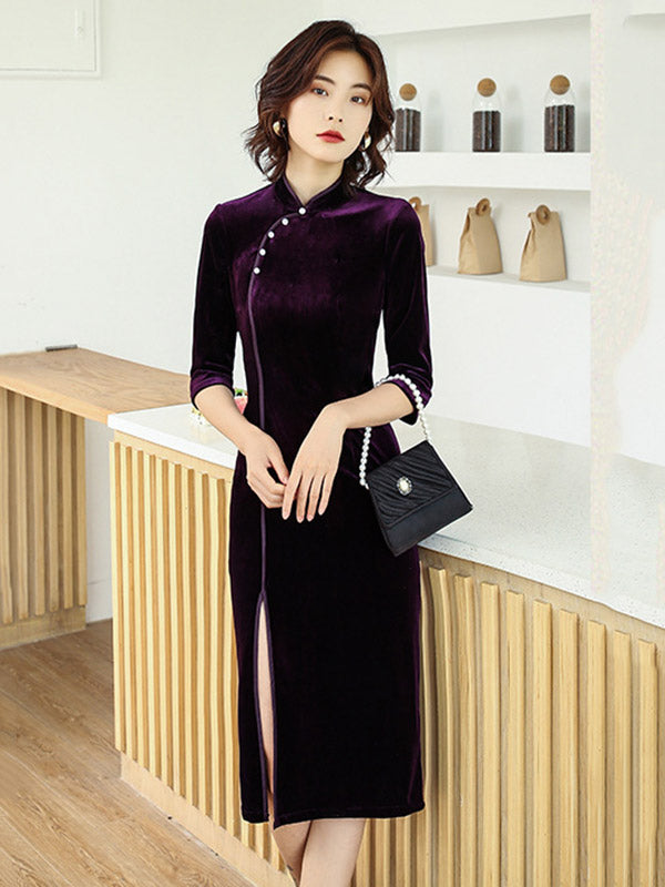 Solid Color Velvet Banquet Split-Side Long Cheongsams