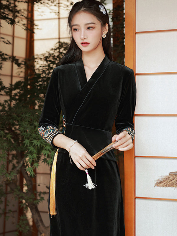 Vintage Loose Printed Keep Warm Velvet Midi Dress Long Cheongsam
