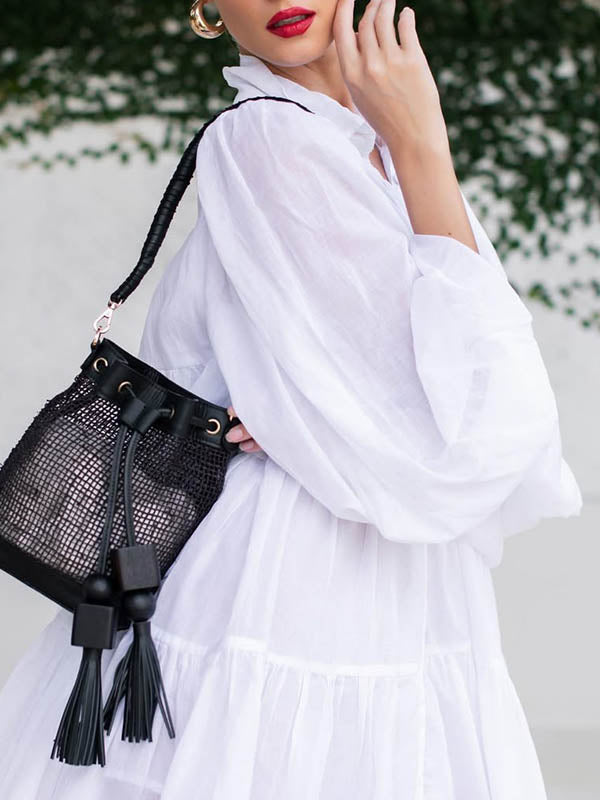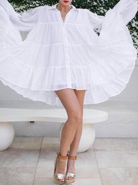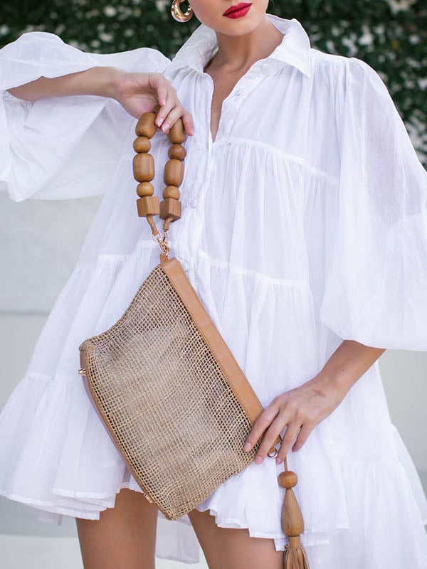 Pleated See-Through Solid Color Split-Joint Loose Puff Sleeves Lapel Shirt Dress Mini Dresses
