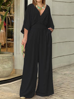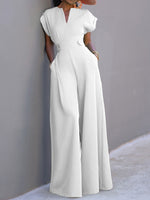 Simple Solid Color V-Neck Half Sleeves Wide Leg Jumpsuits