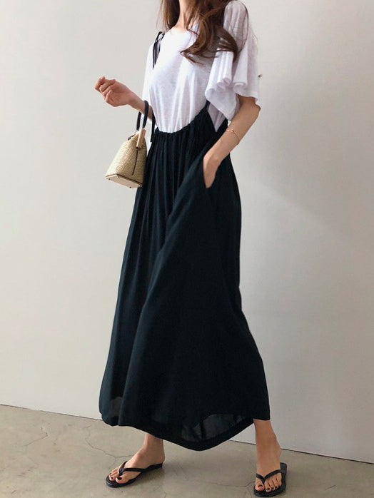 Black&Khaki Casual Spaghetti-Neck Loose Wide-Leg Overalls