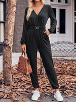 Long Sleeves Puff Sleeves Belted Hollow Solid Color Deep V-Neck Jumpsuits