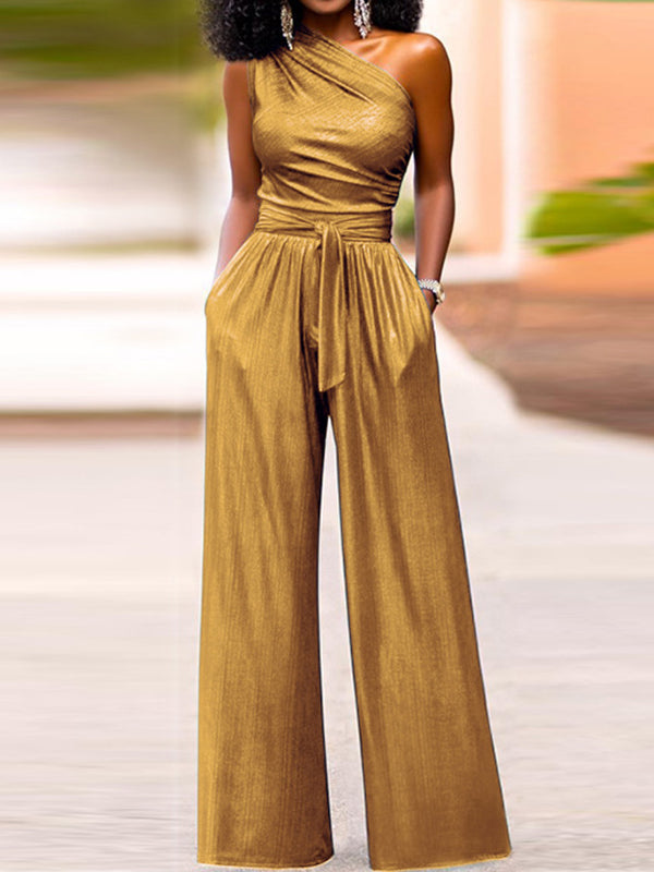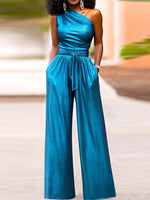 Elasticity Tied Waist High Waisted Wide Leg One-Shoulder Jumpsuits