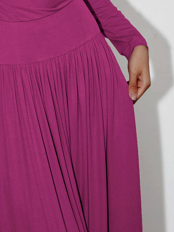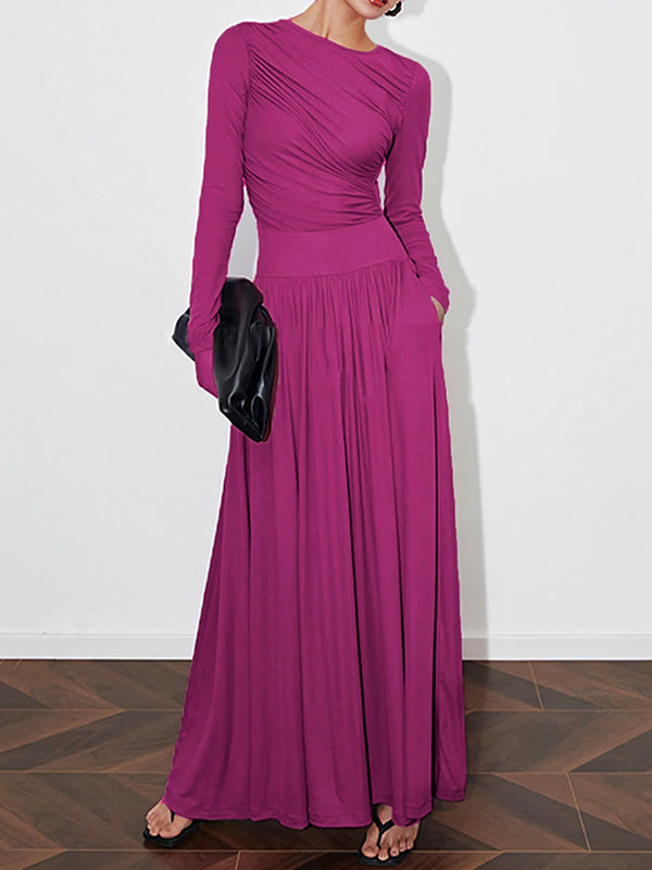 Pleated Solid Color Split-Joint Long Sleeves Round-Neck Maxi Dresses