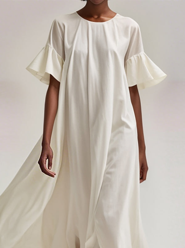 Flower Print Pleated See-Through Solid Color Split-Joint Textured Bodycon Flared Sleeves Round-Neck Maxi Dresses