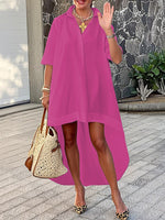 Buttoned Layered Solid Color Split-Front Split-Joint Elasticated Waist Short Sleeves Lapel Shirt Dress Maxi Dresses