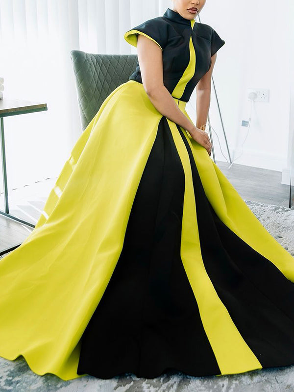 Contrast Color Pleated Split-Joint Flared Sleeves High Waisted Mock Neck Maxi Dresses