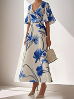 Flower Print Three-quarter Sleeves Round-neck Midi Dresses