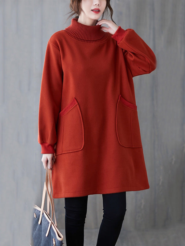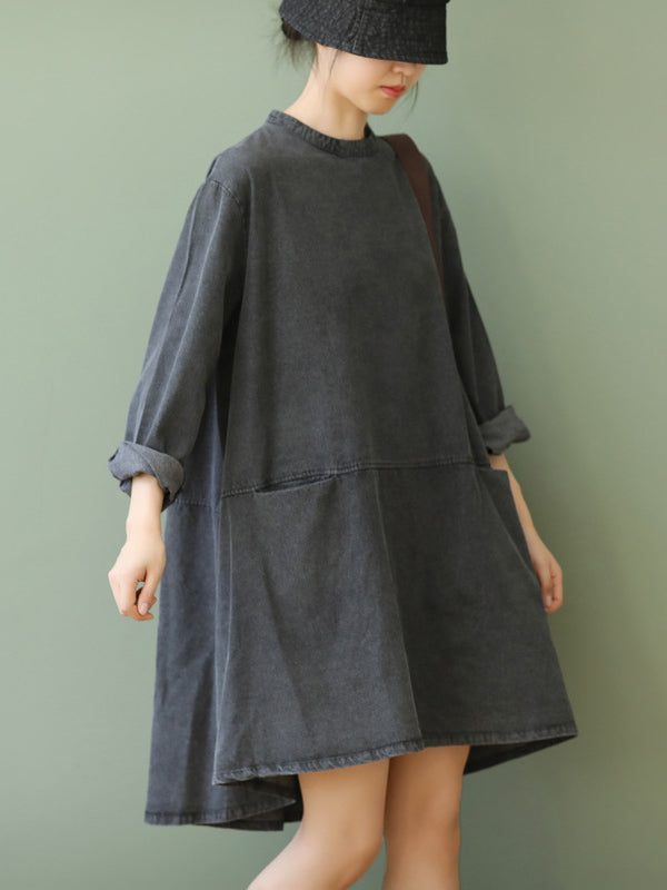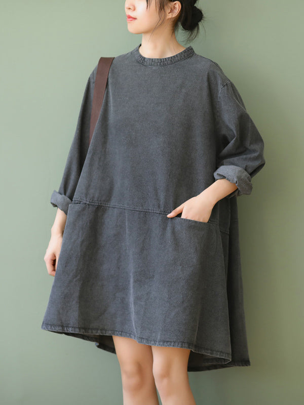 Original Loose Pleated 4 Colors Round-Neck Long Sleeves Short Dress