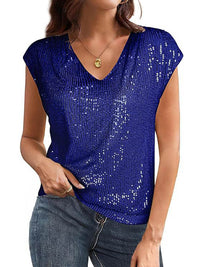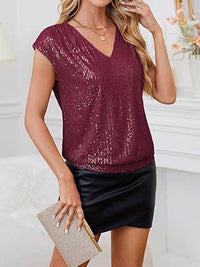 Sequined Solid Color Loose Raglan Sleeve V-Neck T-Shirts Tops