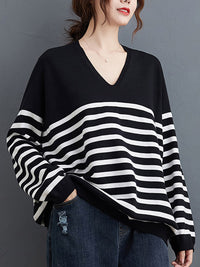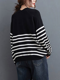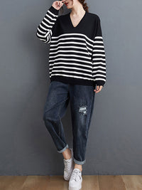Artistic Retro Casual Loose Striped V-Neck Long Sleeves Knitted Sweater