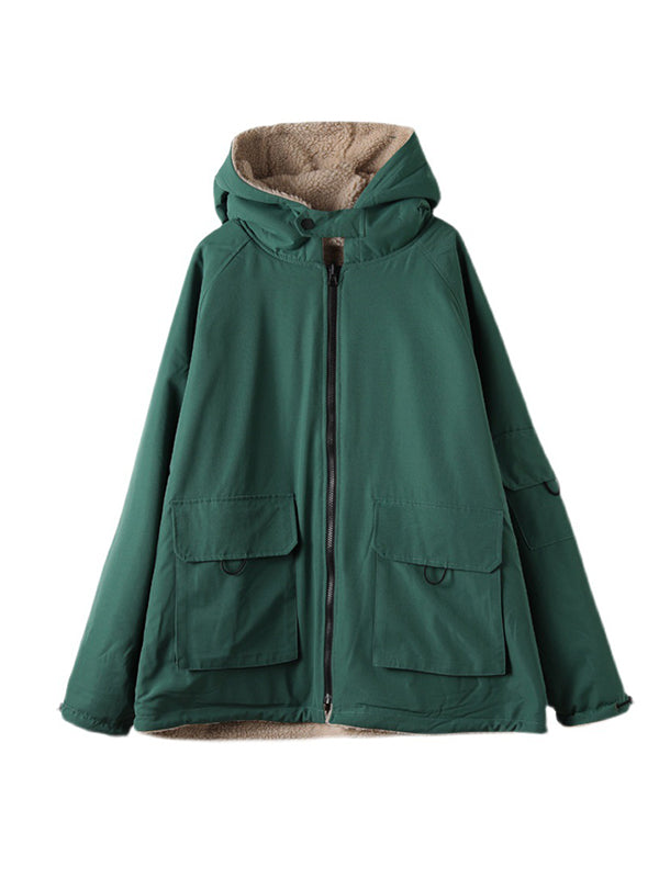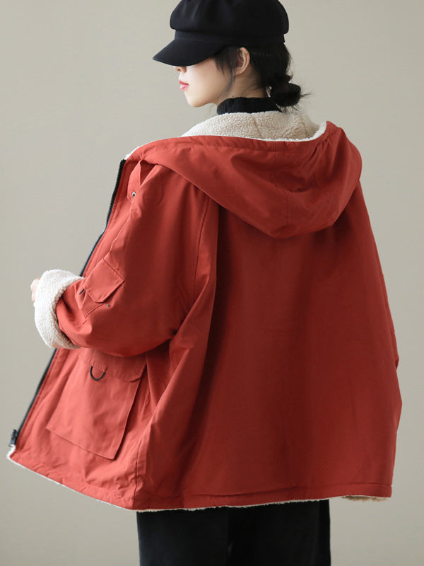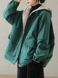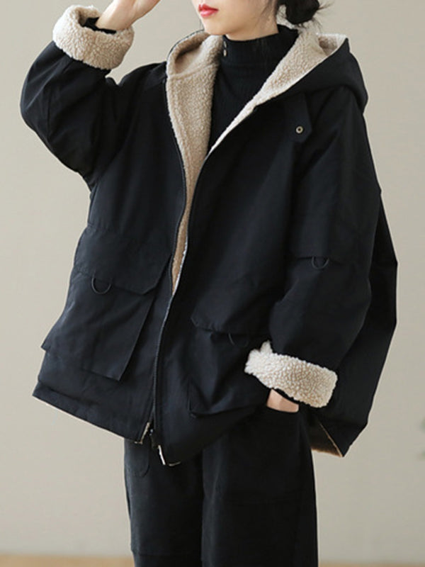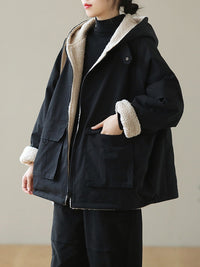 Artistic Retro Long Sleeves Loose Keep Warm Fleece Lining Zipper Hooded Outerwear