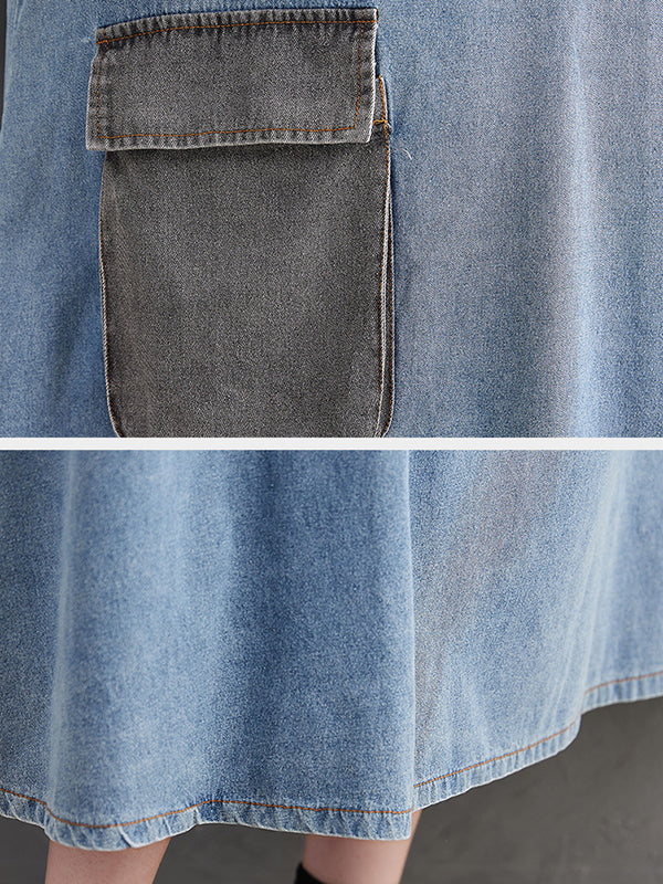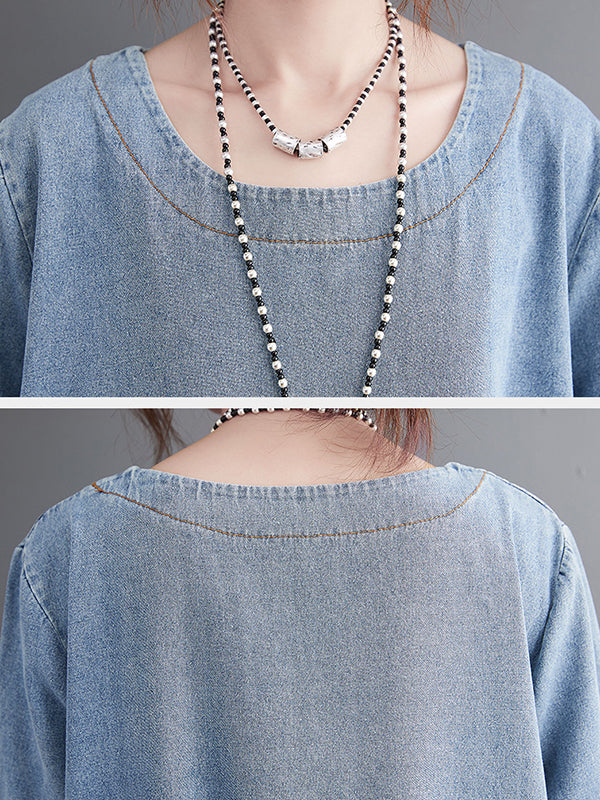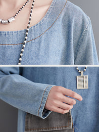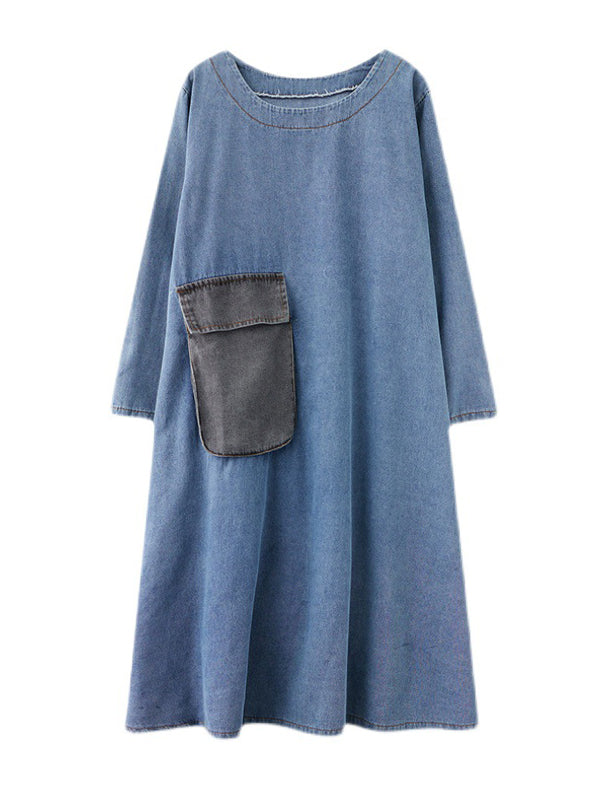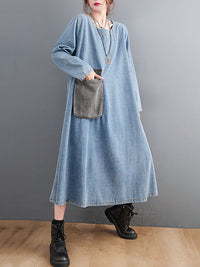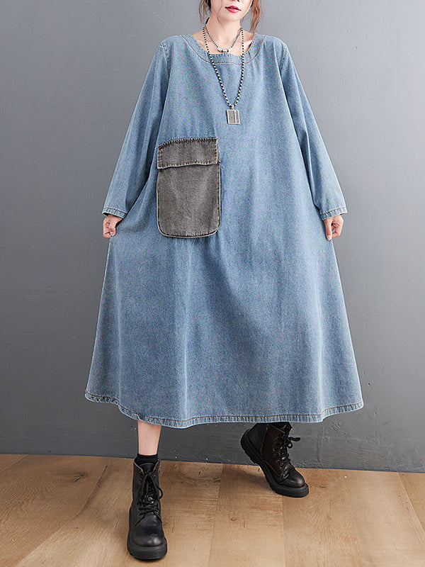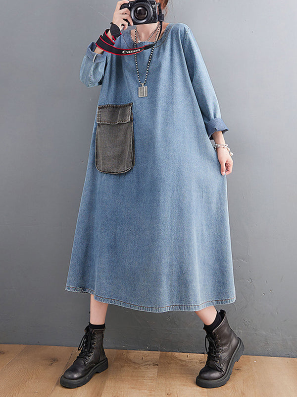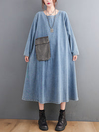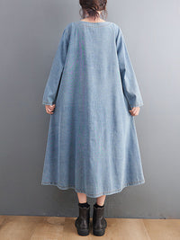 Artistic Retro Loose Denim Applique Round-Neck Long Sleeves Midi Dress