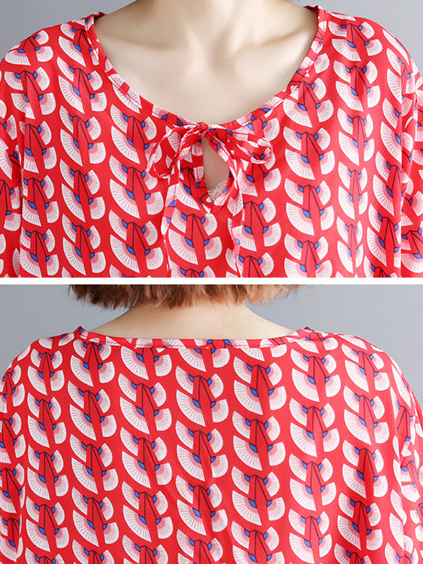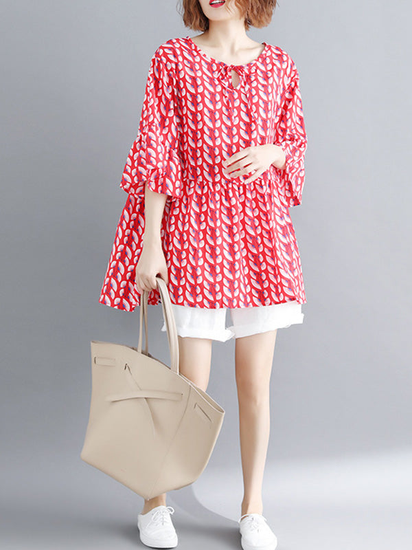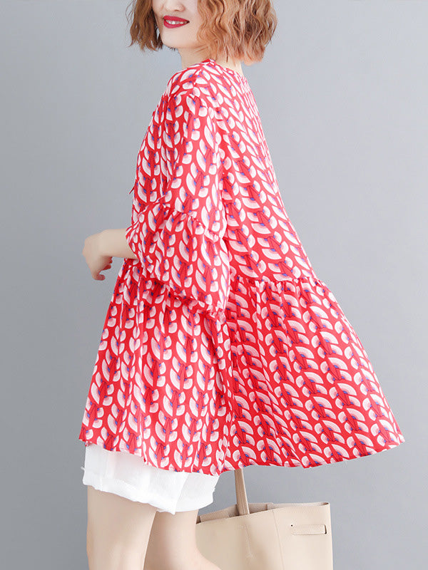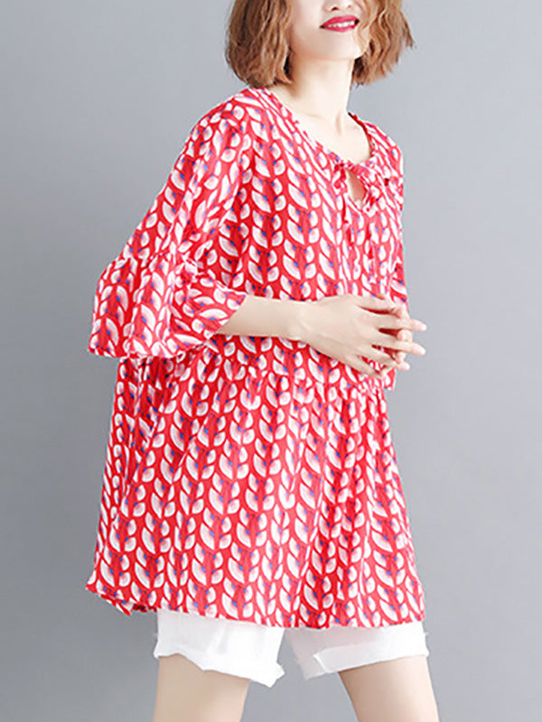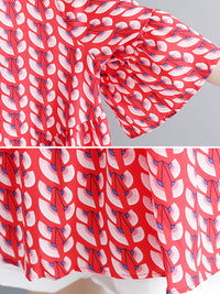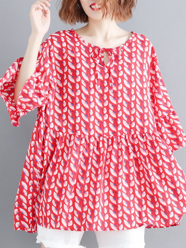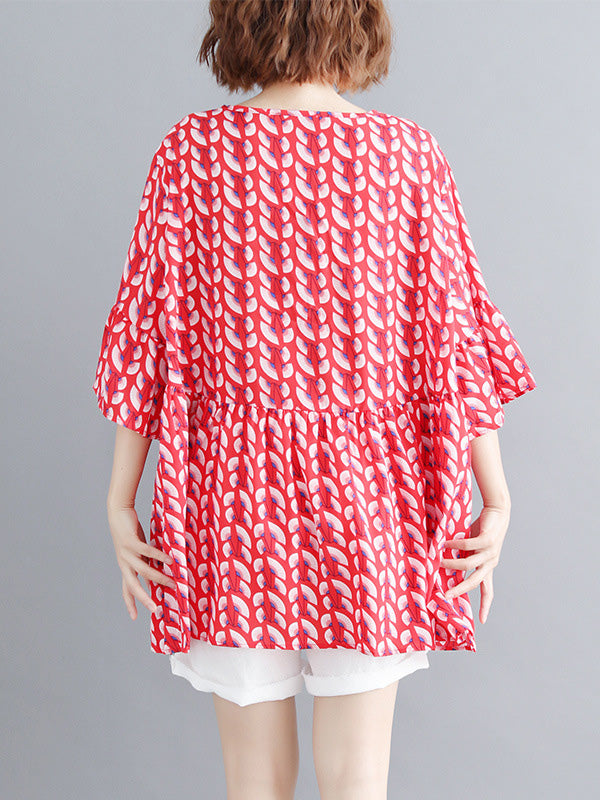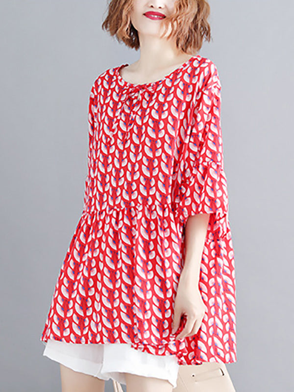 Artistic Retro Loose Half Sleeves Printed Pleated Falbala Round-Neck T-Shirts Tops
