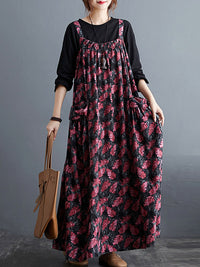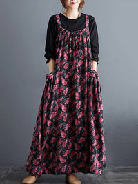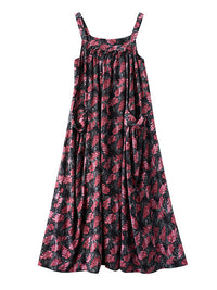 Artistic Retro Ramie Cotton Loose 3 Colors Floral Printed Square-Neck Sleeveless Strap Dress
