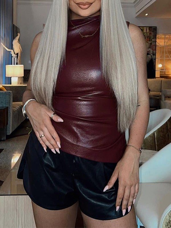 Asymmetric Pleated Solid Color Skinny Sleeveless Mock Neck Vest Top