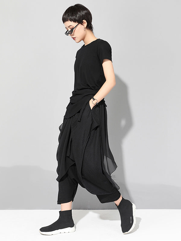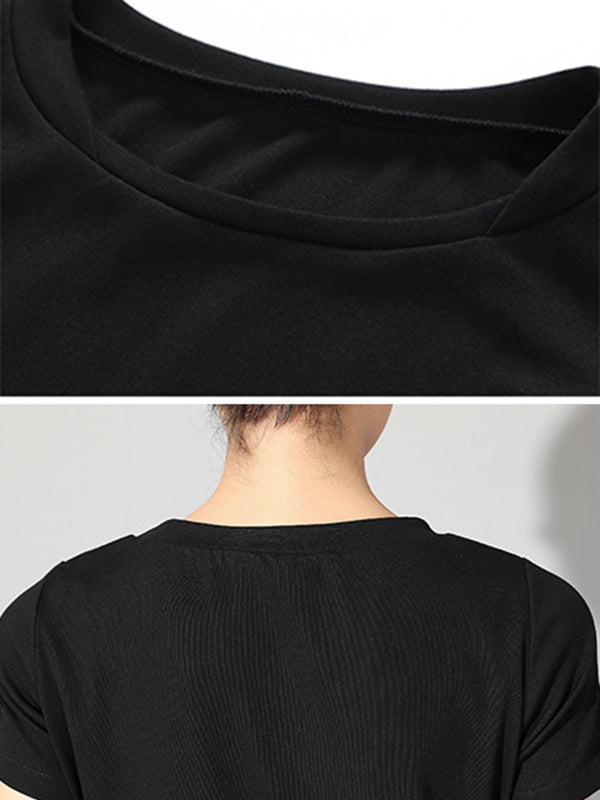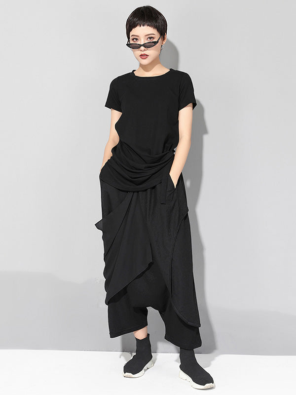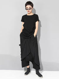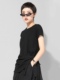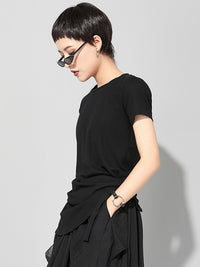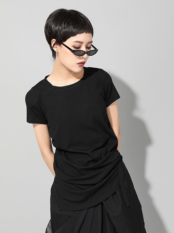 Black Asymmetric Pleats Short Sleeve Round-Neck T-Shirts