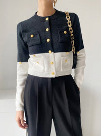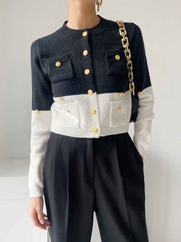 Buttoned Contrast Color Long Sleeves Round-Neck Cardigan Tops