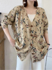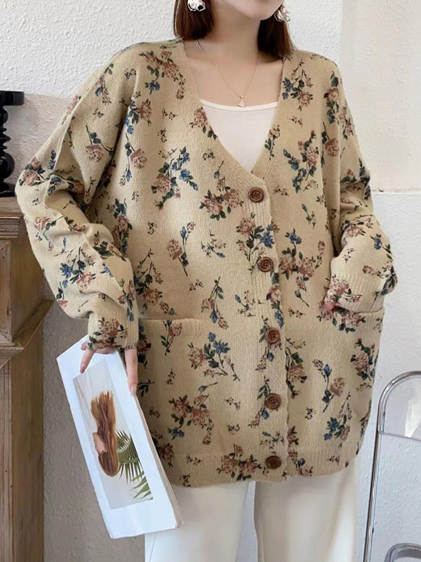 Buttoned Knitted Flower Pockets Long Sleeves Loose V-Neck Cardigan Tops