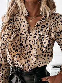 Buttoned Leopard Pleated Ruffled Long Sleeves Loose V-Neck Blouses&Shirts Tops