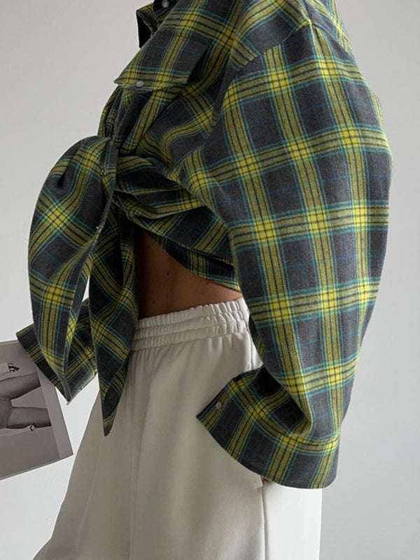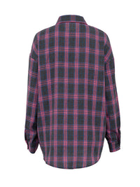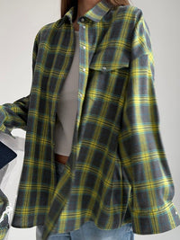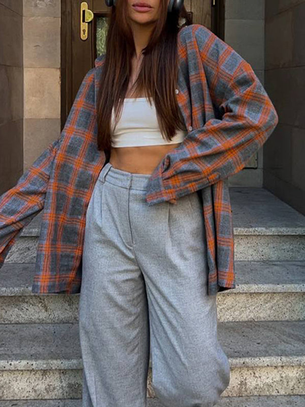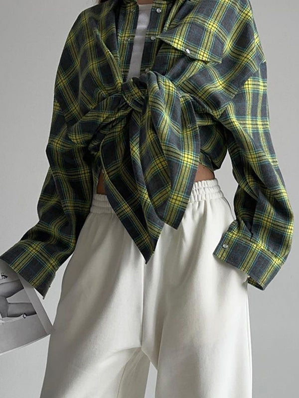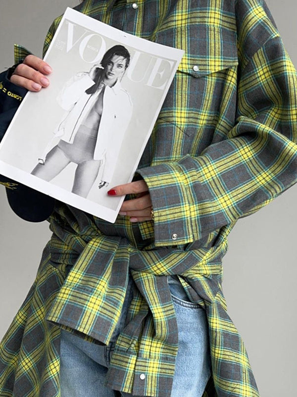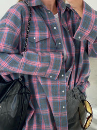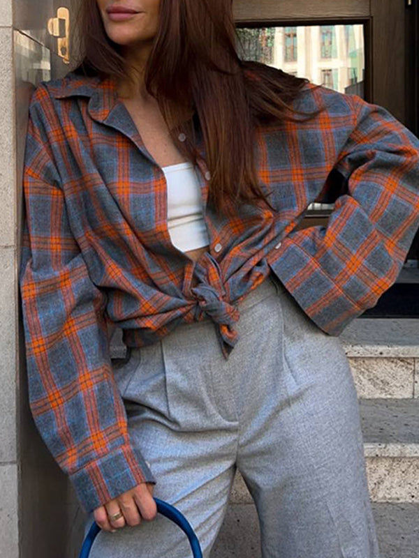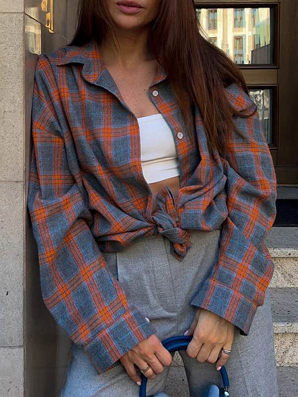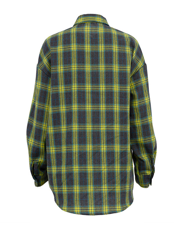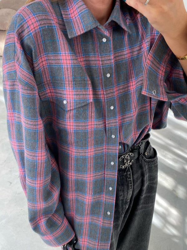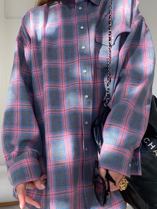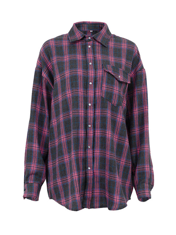 Buttoned Plaid Pockets Split-Joint Long Sleeves Loose Lapel Blouses&shirts Tops