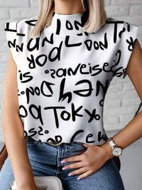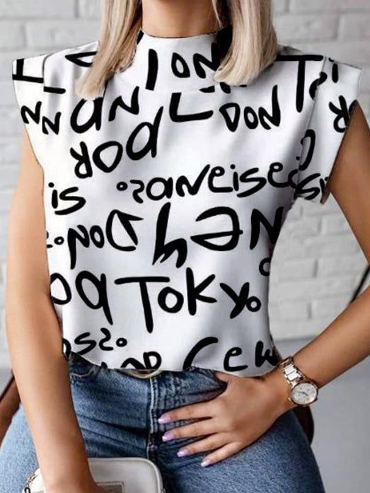 Casual Cap Sleeve Loose Letter Print High-Neck T-Shirts Tops