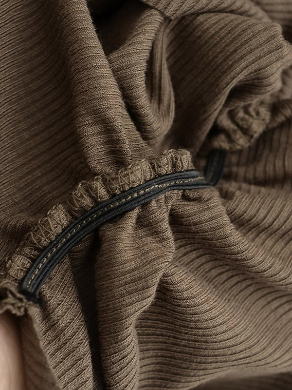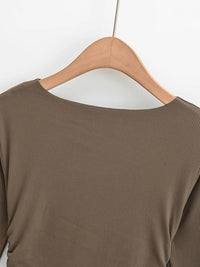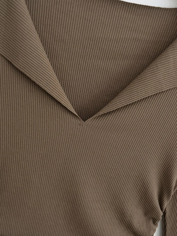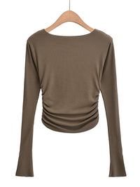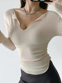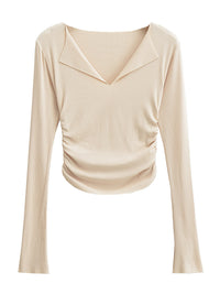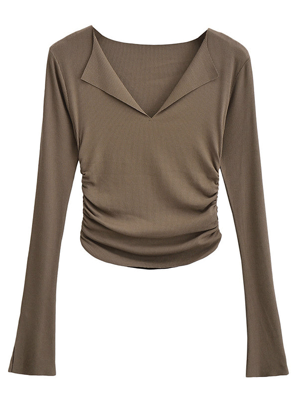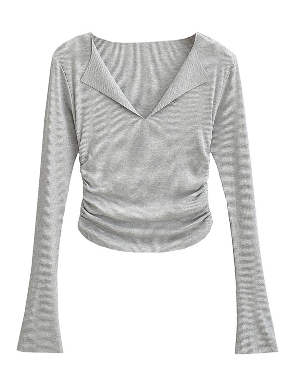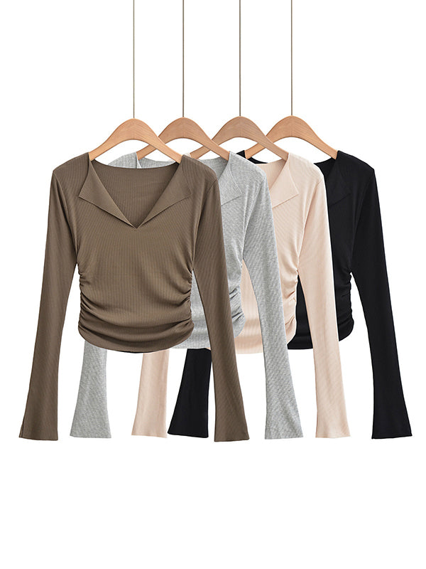 Casual Flared Sleeves Skinny Pleated Solid Color V-Neck T-Shirts Tops