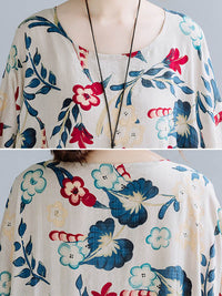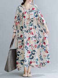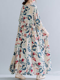 Casual Floral Printed Split-Joint Round-Neck Flared Batwing Sleeves Loose Maxi Dress