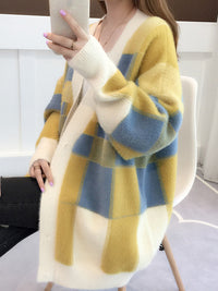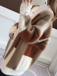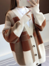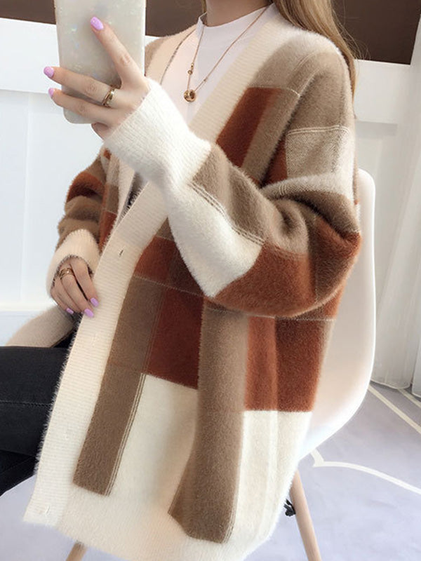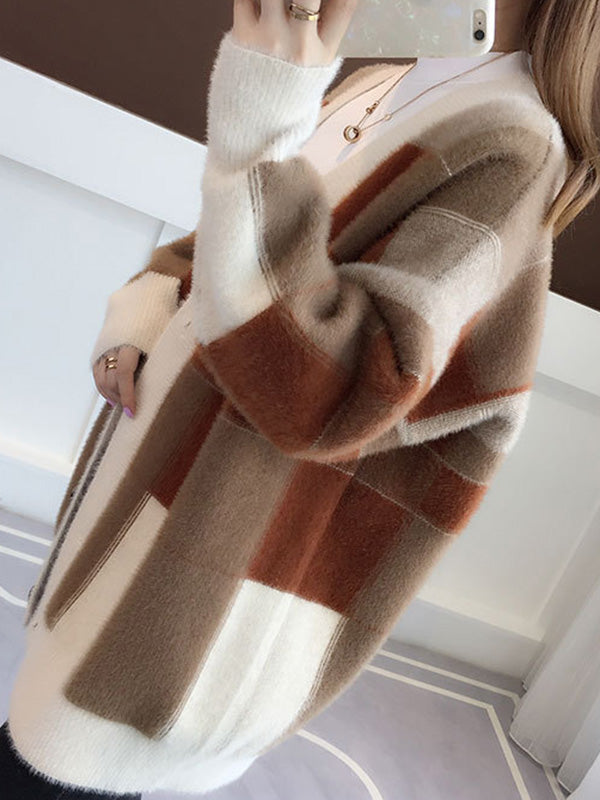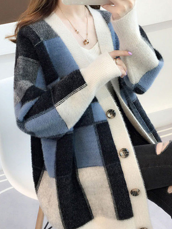 Casual Long Sleeves Loose Buttoned Contrast Color Plaid Deep V-Neck Sweater Tops Cardigan Coats