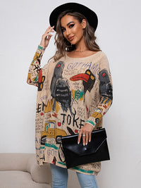 Casual Long Sleeves Loose Cartoon Printed Contrast Color Round-Neck Sweater Tops
