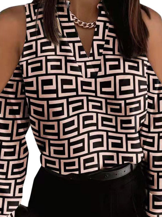 Casual Long Sleeves Loose Contrast Color Hollow V-Neck Blouses&Shirts Tops