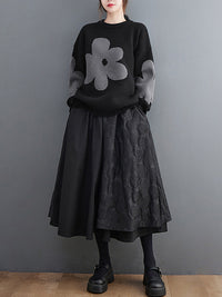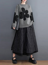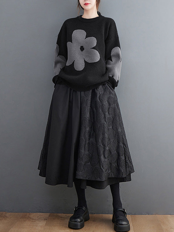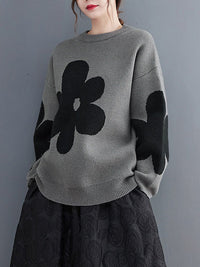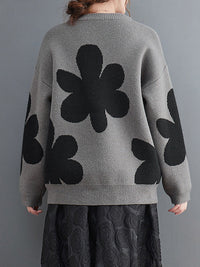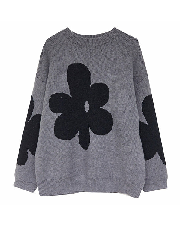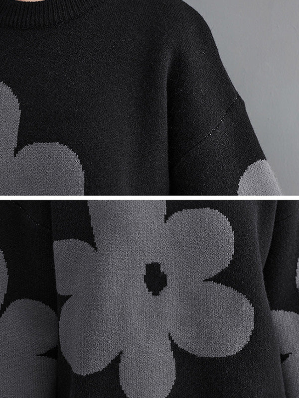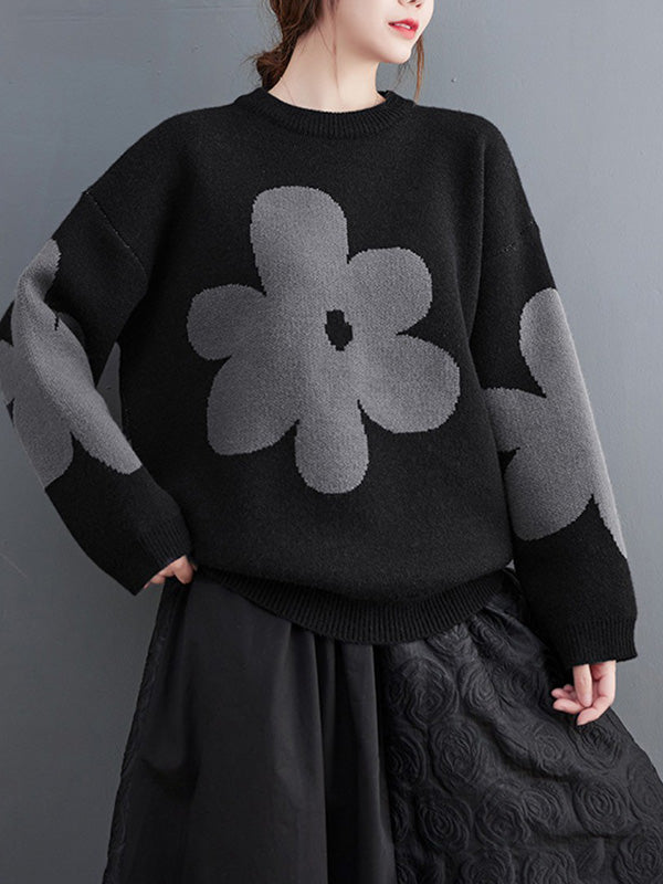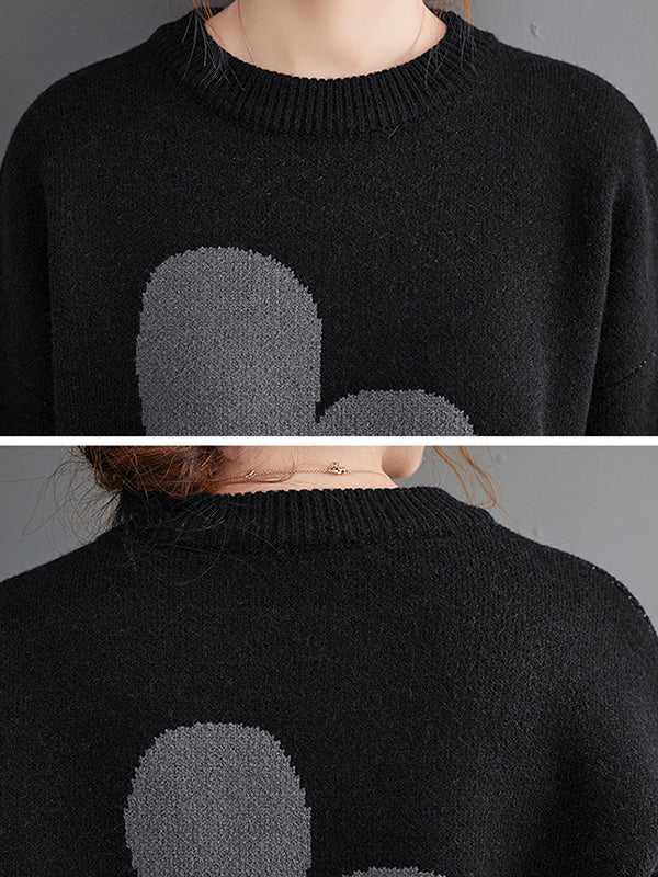 Casual Long Sleeves Loose Contrast Color Jacquard Round-Neck Pullovers