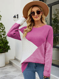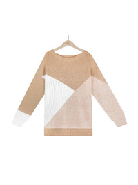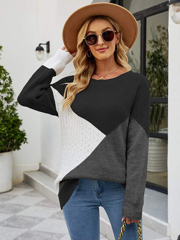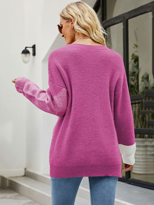 Casual Long Sleeves Loose Contrast Color Round-Neck Sweater Tops