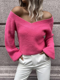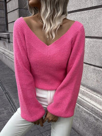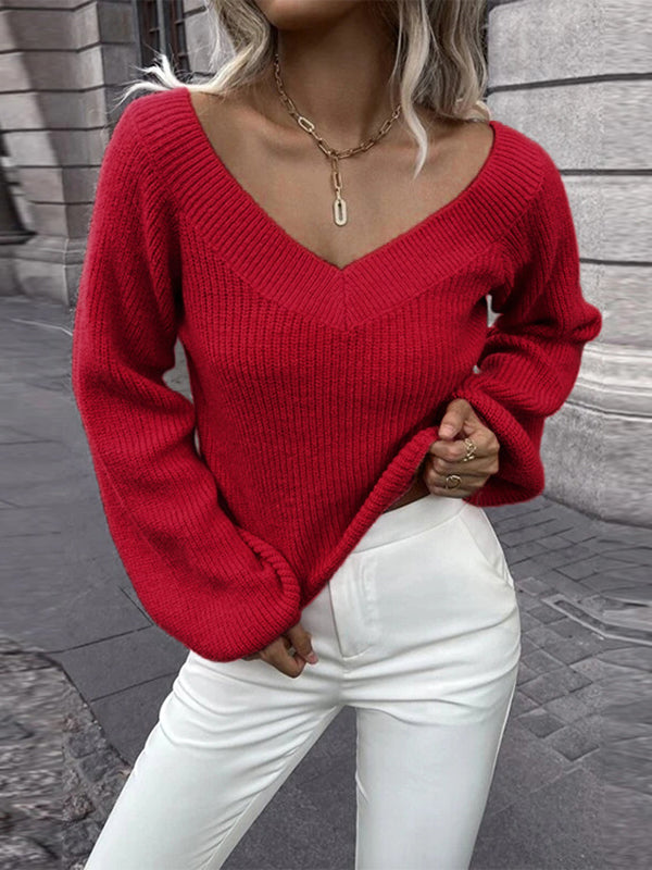 Casual Long Sleeves Loose Solid Color V-Neck Sweater Tops