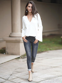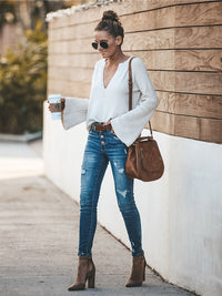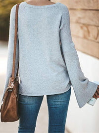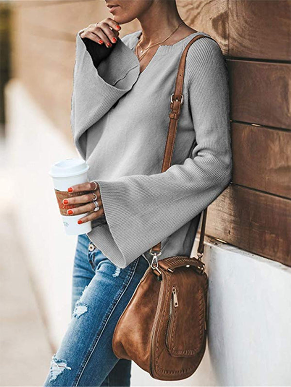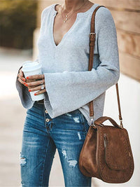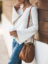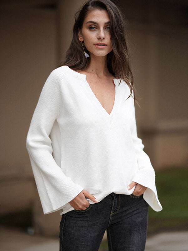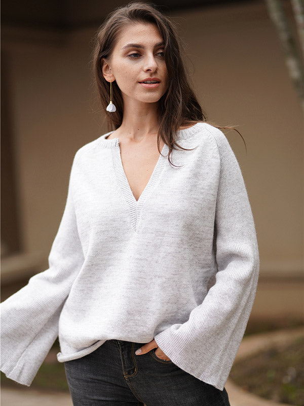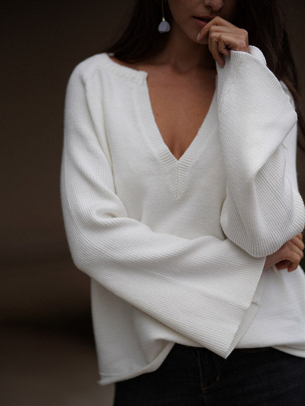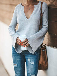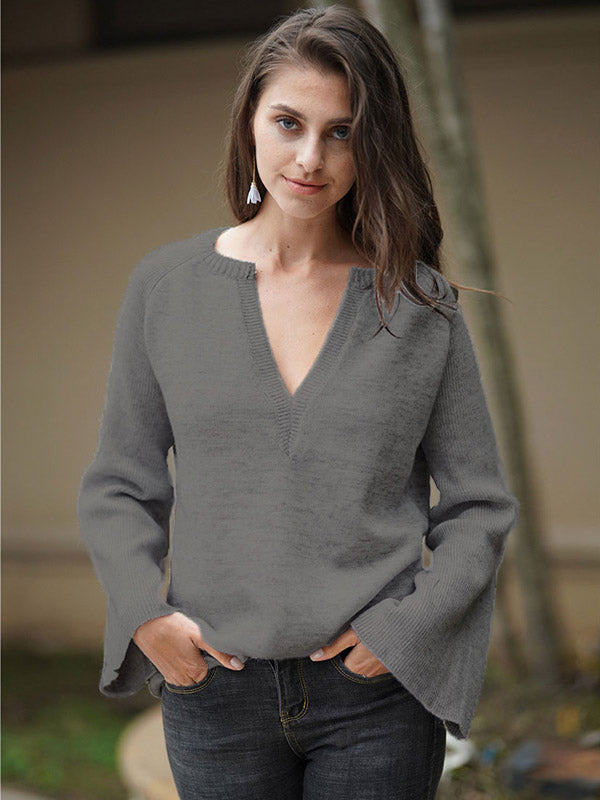 Casual Long Sleeves Loose Solid Color V-Neck Sweater Tops