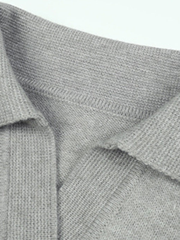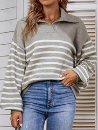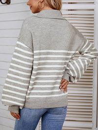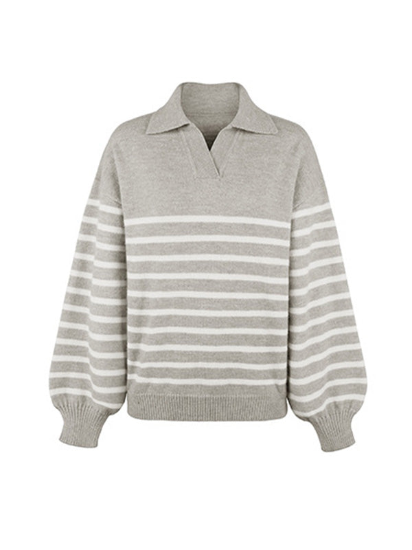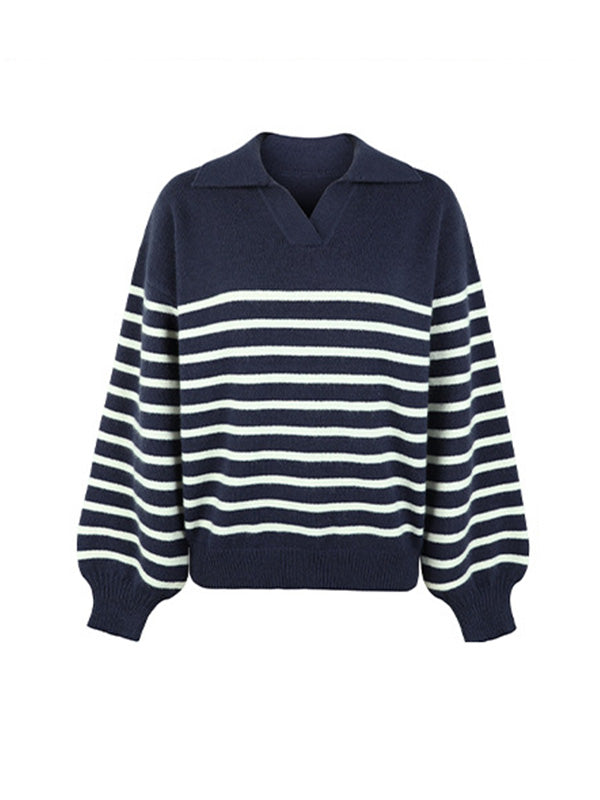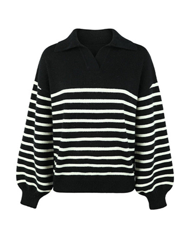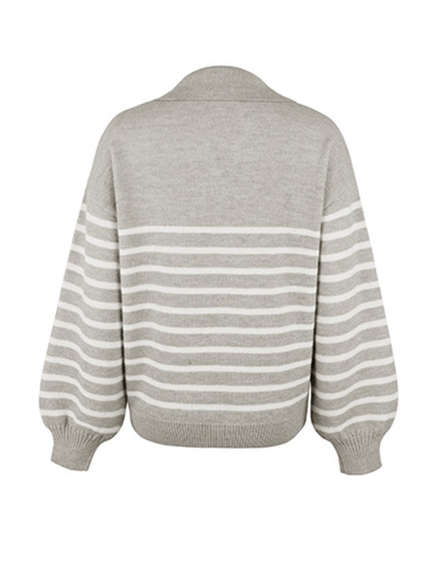 Casual Long Sleeves Loose Striped Lapel Collar Sweater Tops