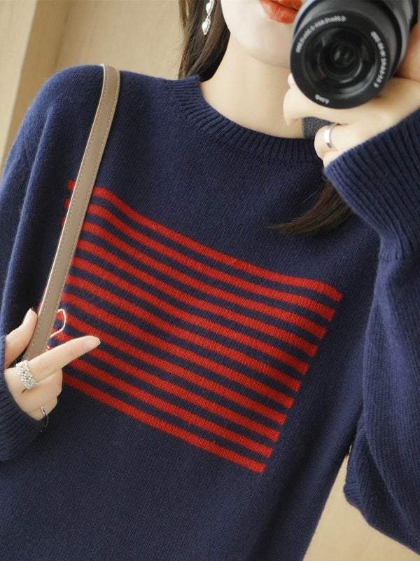 Casual Loose Long Sleeves Striped Round-Neck Sweater Tops