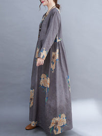 Casual Loose Pleated Flower Printed Round-Neck Long Sleeves Maxi Dress