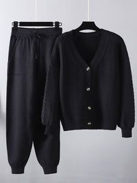 Casual Loose Solid Color Long Sleeves V-Neck Cardigan Tops& Drawstring Pants Suits