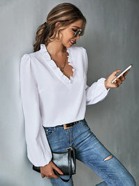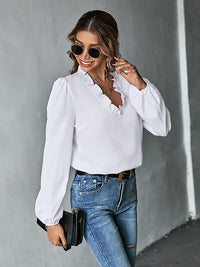 Casual Puff Sleeves Loose Falbala Solid Color V-Neck Blouses&Shirts Tops