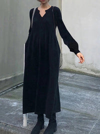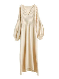 Causal Loose Solid Color Pleated V-Neck Long Puff Sleeves Sweater Dress