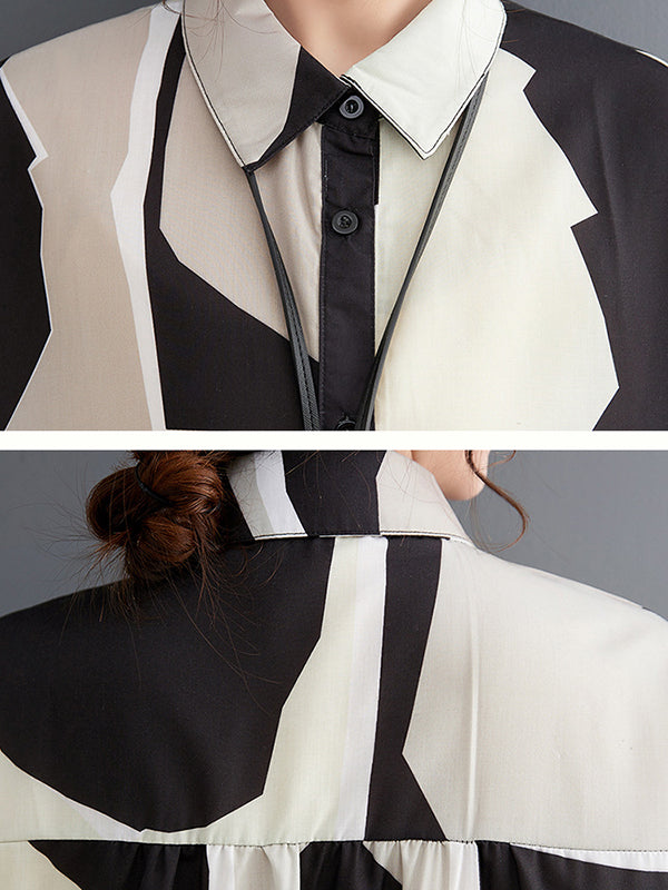 Color-Block Printed Loose Oversize Lapel Shirt Dress Midi Dresses