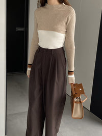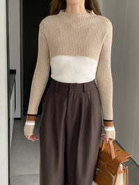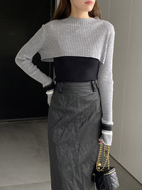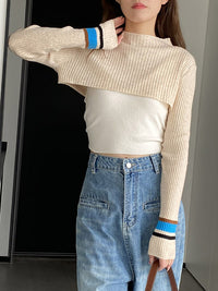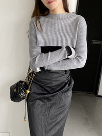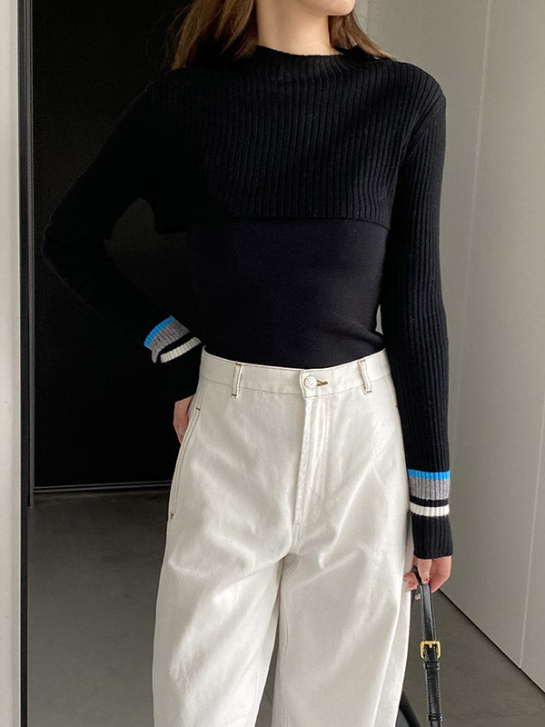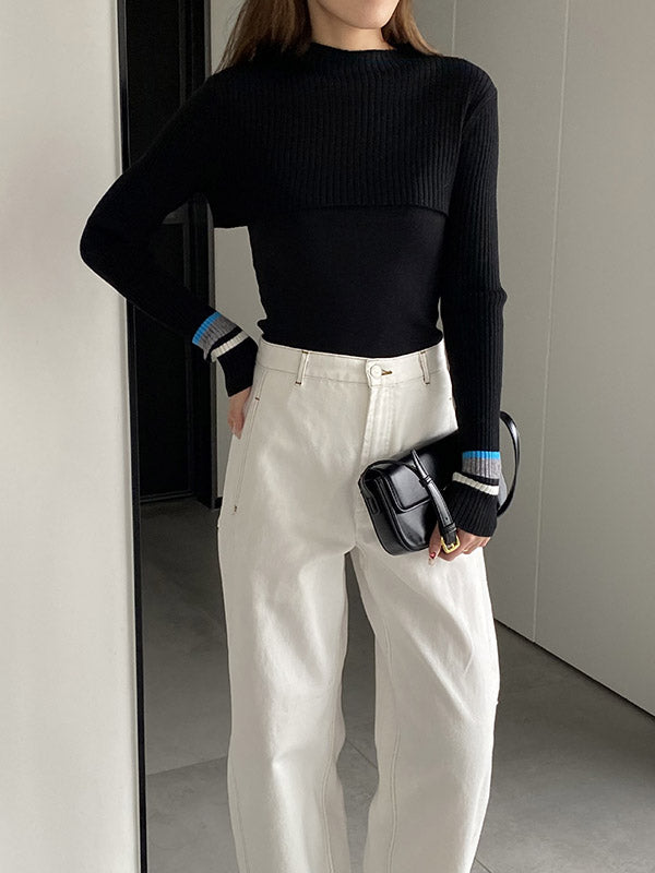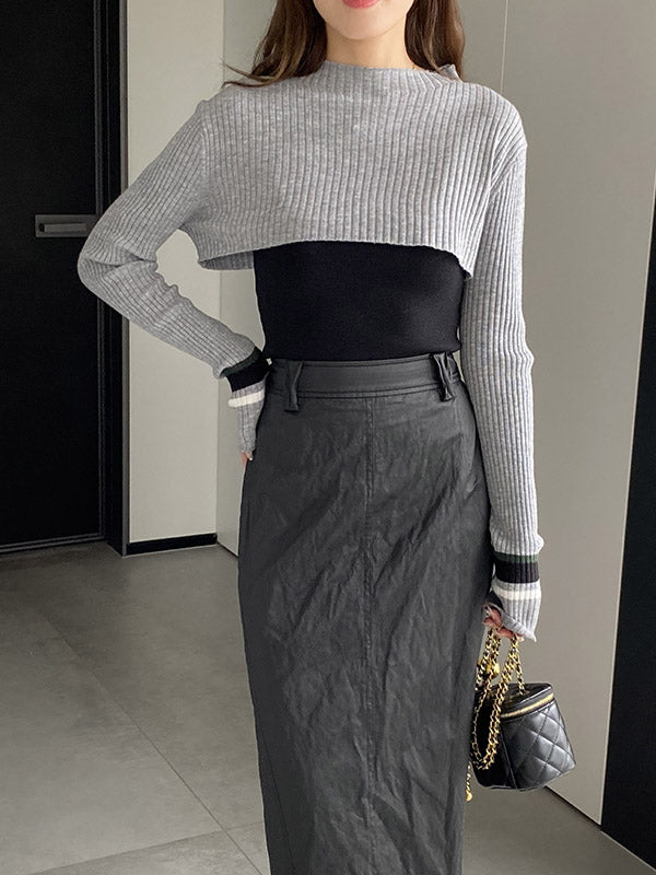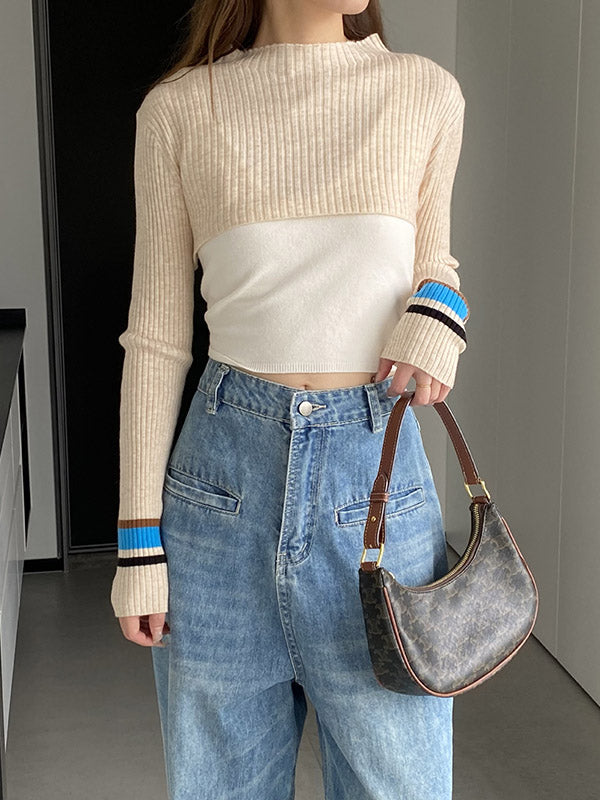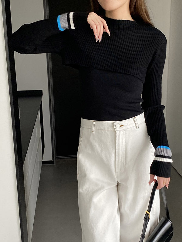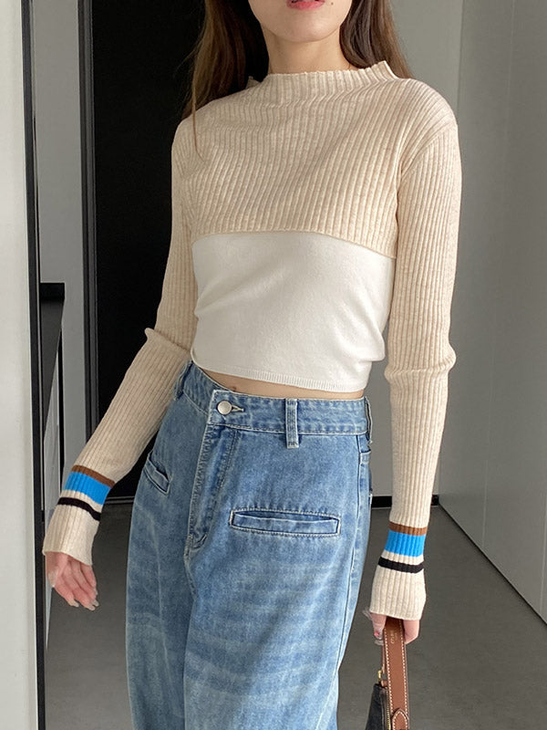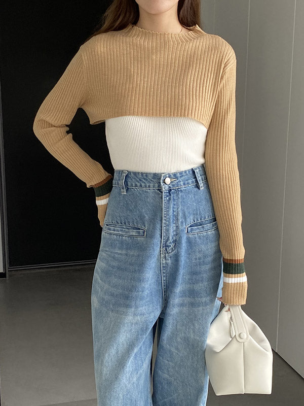 Contrast Color Long Sleeves Loose Round-Neck Two Pieces Set Cover-Ups Tops