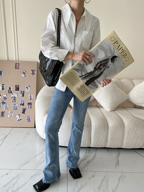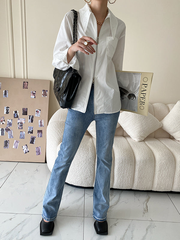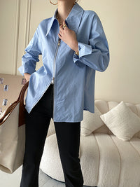 Fashion Long Sleeves Solid Color Zipper Lapel Collar Blouses