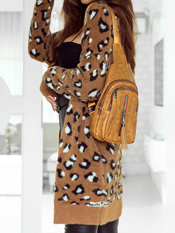 Keep Warm Leopard Velvet Long Sleeves Loose Collarless Cardigan Tops