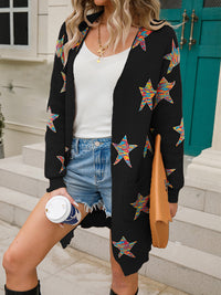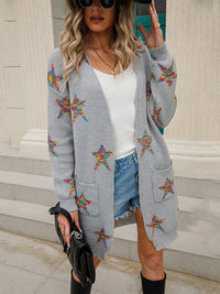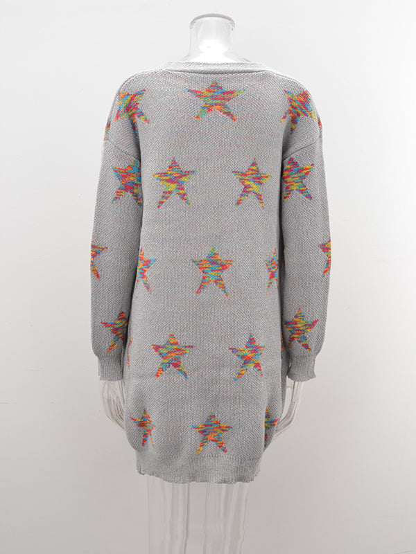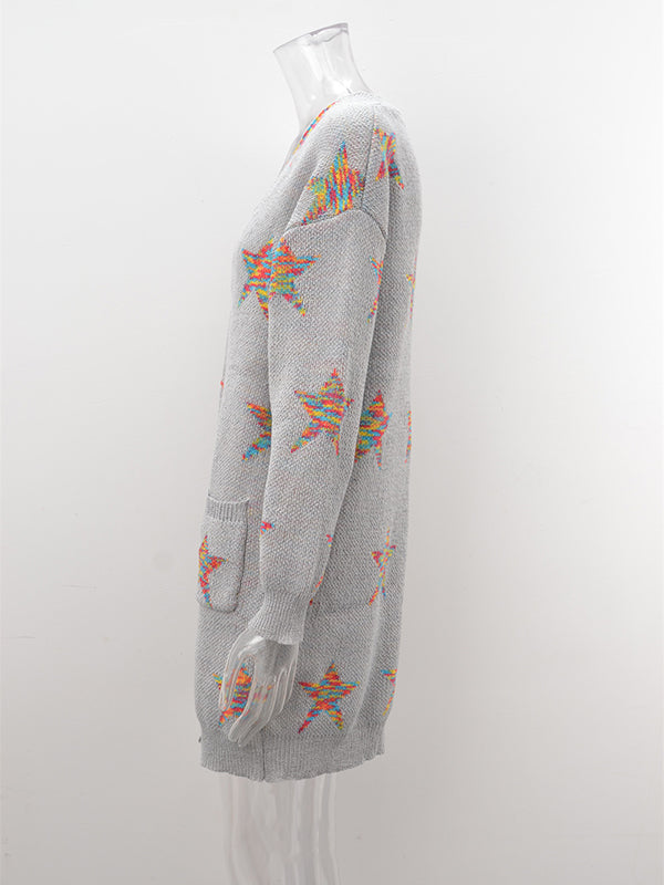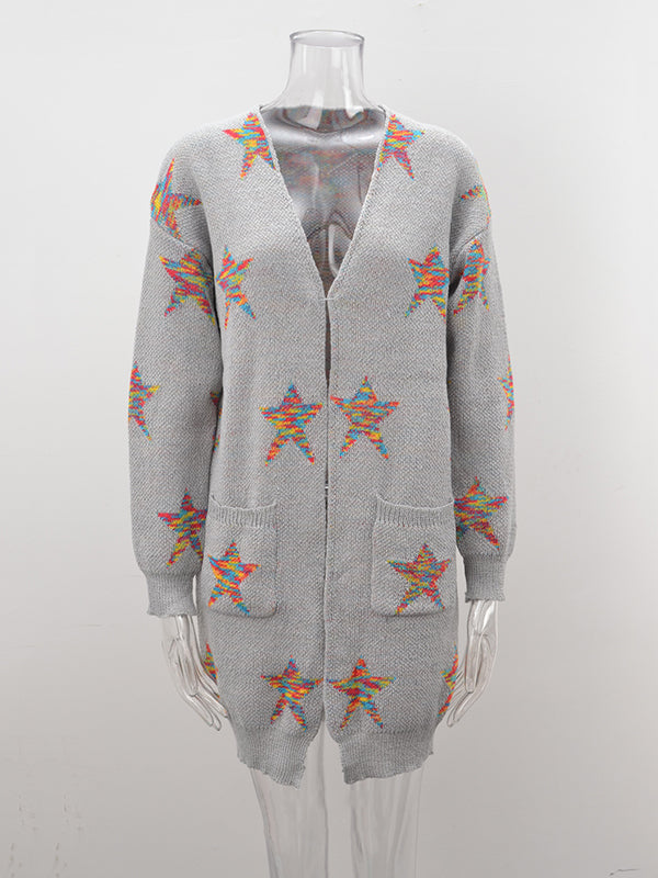 Knitted Pentagram Pockets Long Sleeves Loose V-Neck Cardigan Tops