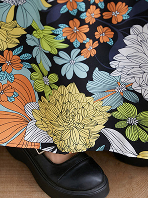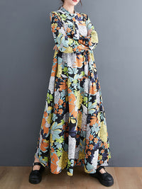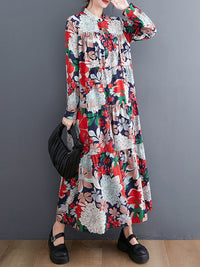 Long Sleeves Loose Floral Printed Round-Neck Midi Dresses