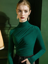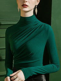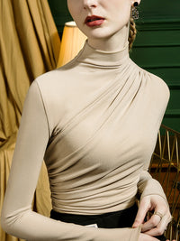 Long Sleeves Skinny Pleated Solid Color Half Turtleneck T-Shirts Tops
