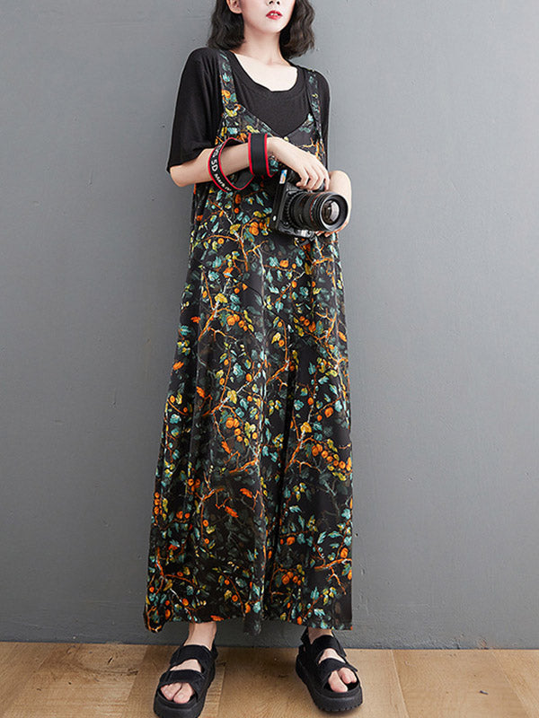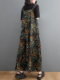 Loose Artistic Retro Ramie Cotton Floral Printed V-Neck Overalls