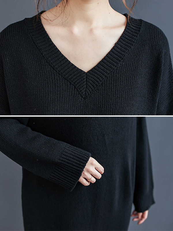 Loose Casual Solid Color V-Neck Long Sleeves Knitted Midi Dress